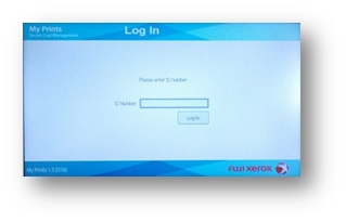 To release your job from the queue, go to any of the MFD's located in the Computer Room or Main Library.  You will be asked to log in.  Your login is the 5 numbers in your library barcode. Use the number pad on the printer to enter this number.